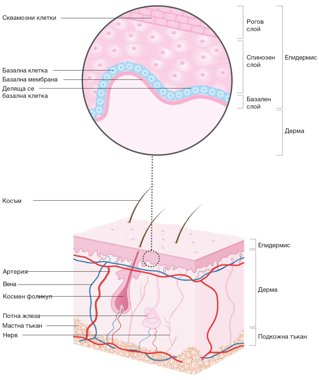 - Базално-клетъчният карцином (БКК) е най-честият рак на кожата, който при 80% от пациентите се развива в областта на главата и шията, често при липса на предракови лезии. Развива се от клетките в базалния слой (basal cell) на епидермиса. Метастазира рядко. Високата заболеваемост се дължи на локалната инвазия и тъканна деструкция. 2,4