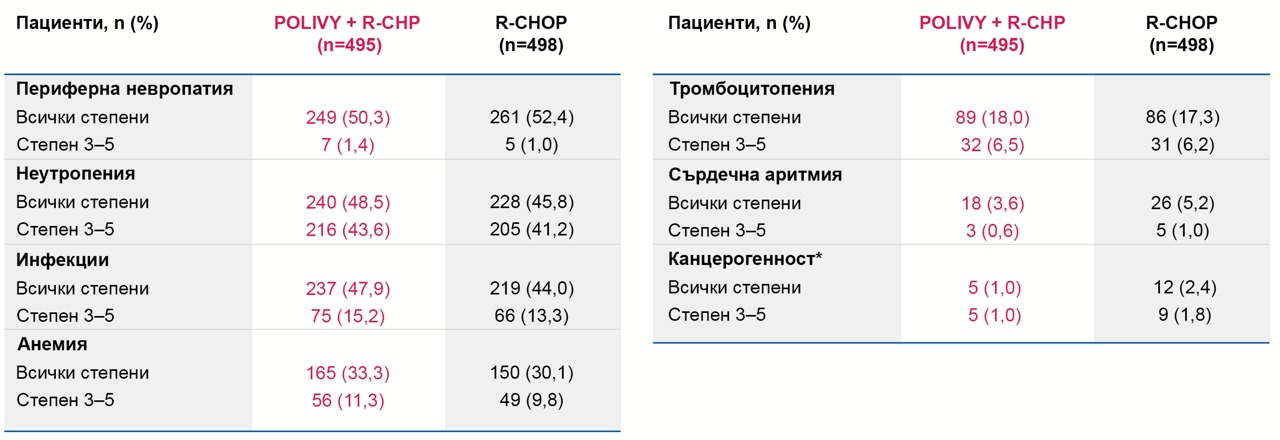 *„Канцерогенност“ включва TEAEs (Treatment-Emergent Adverse Event-нежелани събития, които се появяват по време на лечението) с начални дати, настъпващи по време на периода на докладване на нежелани събития и след периода на докладване на TEAE. Периодът на докладване на TEAE се определя като ново или влошаващо се нежелано събитие от първата доза на което и да е изследвано лекарство до 90 дни след последната доза на което и да е изследвано лекарство или преди NALT, което от двете настъпи по-рано. Събитията, свързани с канцерогенност в групата с R-CHOP, включват аденокарцином (2 пациенти), рак на простатата (2 пациенти), глиобластом, карцином на базалните клетки, злокачествено новообразувание на белия дроб, лимфоцитна левкемия, злокачествен меланом in situ, остра миелоидна левкемия, карцином на глотиса и болест на Ходжкин, а в групата с Pola-R-CHP включват аденокарцином на дебелото черво (2 пациенти), колоректален рак (2 пациенти) и папиларен карцином на бъбречните клетки.