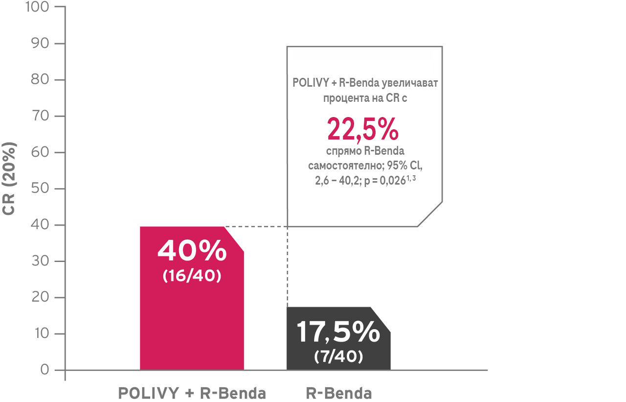 - В актуализирания анализ (медиана на проследяване: 48,9 месеца) честотата на CR е 42,5% (17/40) за POLIVY + R-Benda спрямо 17,5% (7/40) за R-Benda*2
