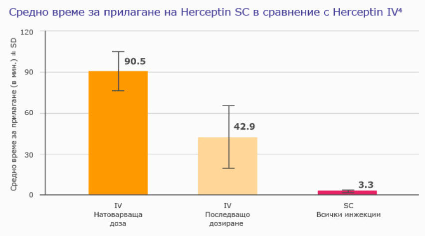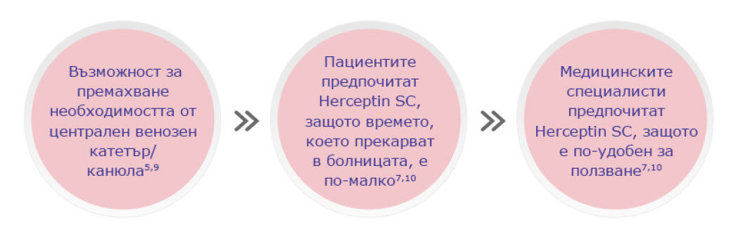 Подкожната форма на медикамента (Herceptin SC), осигурява всички предимства на Herceptin, но приложен в рамките на 2 до 5 минути4-6